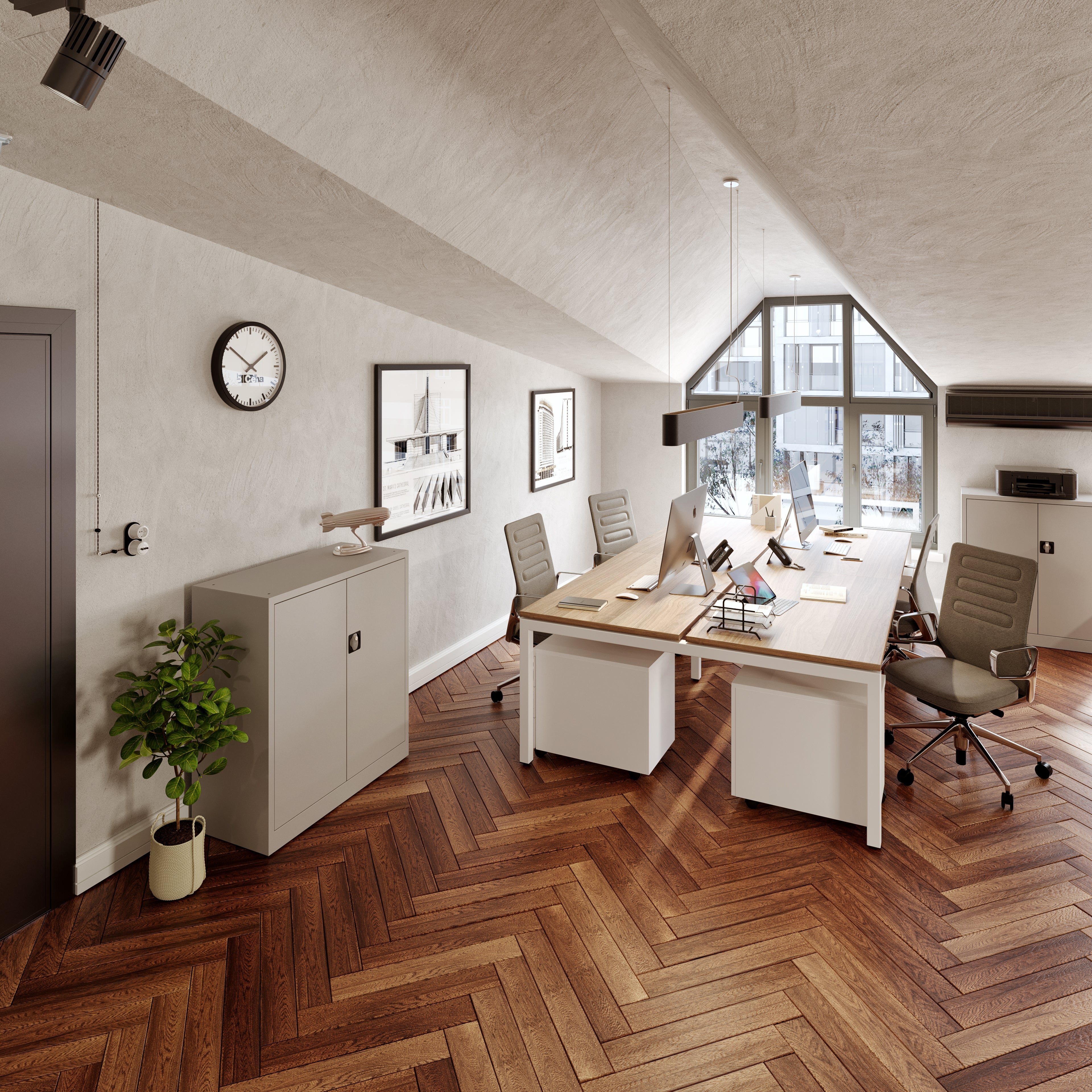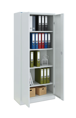 The height-adjustable shelves and 180° reinforced hinged doors make them ideal for offices, archives, and industrial facilities. Equipped with a square handle lock with a two-point Espagnolet locking system, these cabinets ensure the safety and organization of your documents and supplies.