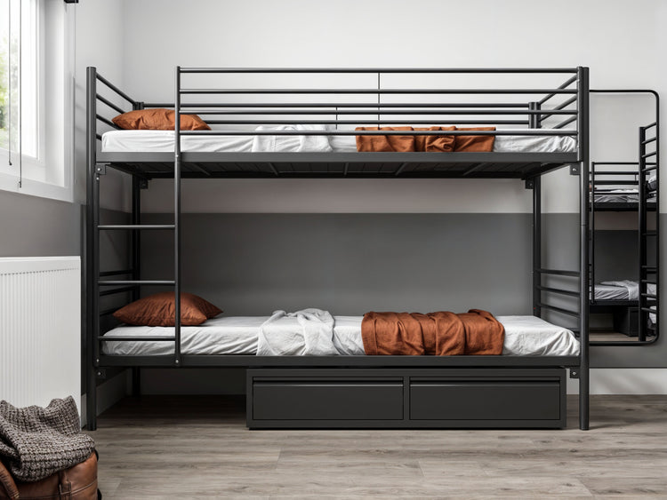 Built for durability, safety, and versatility, the HRT-TUV Twin Metal Bunk Bed is a smart space-saving solution for any room. Crafted from high-quality tubular steel, this bed offers a strong, stable frame and a modern industrial look.